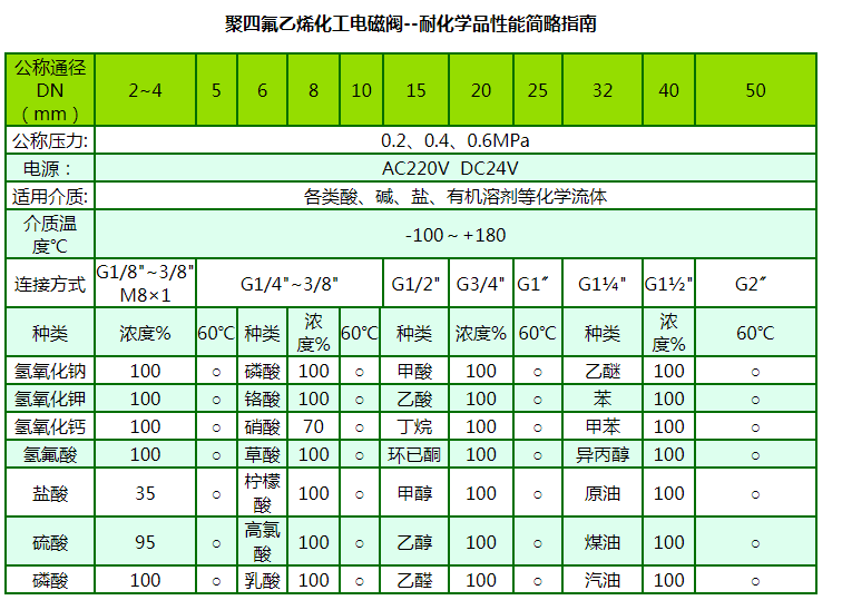 “禹成牌”化工電磁閥由于啟閉原理的獨特性和結構設計的科學性,產品的所有部件均可根據(jù)不同的化學介質選用不同的高分子材料制造,同時由于它的先導孔和卸壓孔是傳統(tǒng)閥的幾十倍大,復位彈簧設置在介質外,因此它具有不易堵塞、耐酸堿、抗腐蝕和使用壽命長等優(yōu)點,可適應于各種化學流體介質,是化工流體自動化生產設備的最佳配套產品。