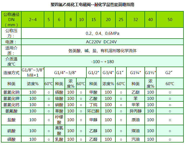 “禹成牌”化工電磁閥由于啟閉原理的獨(dú)特性和結(jié)構(gòu)設(shè)計的科學(xué)性,產(chǎn)品的所有部件均可根據(jù)不同的化學(xué)介質(zhì)選用不同的高分子材料制造,同時由于它的先導(dǎo)孔和卸壓孔是傳統(tǒng)閥的幾十倍大,復(fù)位彈簧設(shè)置在介質(zhì)外,因此它具有不易堵塞、耐酸堿、抗腐蝕和使用壽命長等優(yōu)點(diǎn),可適應(yīng)于各種化學(xué)流體介質(zhì),是化工流體自動化生產(chǎn)設(shè)備的最佳配套產(chǎn)品。