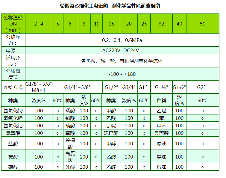 聚四氟乙烯化工電磁閥具有優(yōu)異的耐腐蝕性能,對(duì)所有的常用化學(xué)品都呈惰性。幾乎可以抵抗所有化學(xué)介質(zhì)(包括濃硫酸和王水)。具有優(yōu)異的耐熱性能,應(yīng)用溫度為-100~180℃,材料可長(zhǎng)期在230~260℃下工作。特別適合腐蝕嚴(yán)重、溫度高且化學(xué)品不允許與潤(rùn)滑劑接觸的環(huán)境。