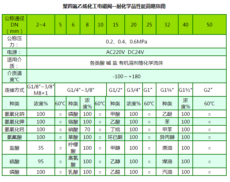 “禹成牌”化工電磁閥由于啟閉原理的獨(dú)特性和結(jié)構(gòu)設(shè)計(jì)的科學(xué)性,產(chǎn)品的所有部件均可根據(jù)不同的化學(xué)介質(zhì)選用不同的高分子材料制造,同時(shí)由于它的先導(dǎo)孔和卸壓孔是傳統(tǒng)閥的幾十倍大,復(fù)位彈簧設(shè)置在介質(zhì)外,因此它具有不易堵塞、耐酸堿、抗腐蝕和使用壽命長(zhǎng)等優(yōu)點(diǎn),可適應(yīng)于各種化學(xué)流體介質(zhì),是化工流體自動(dòng)化生產(chǎn)設(shè)備的最佳配套產(chǎn)品。