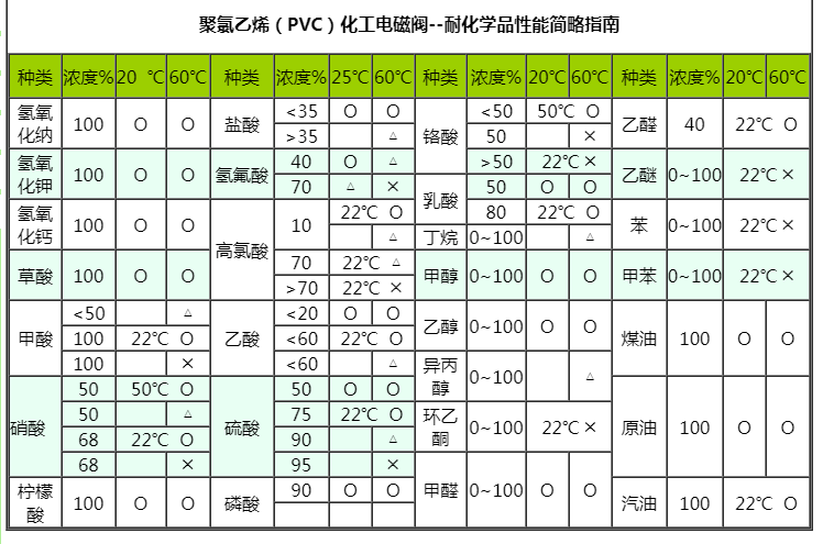 聚氯乙烯(PVC)化工電磁閥具有優(yōu)良的耐腐蝕性能,耐酸(包括稀硝酸)、堿、鹽、氣體、水等的腐蝕。對(duì)無(wú)極性的烷烴及強(qiáng)極性的羧酸、醇類(lèi)有較大的抗溶劑能力。少數(shù)氧化性酸在濃度較高時(shí)對(duì)其有較大的腐蝕作用。有一定的剛度和強(qiáng)度,適用溫度為-0~60℃。