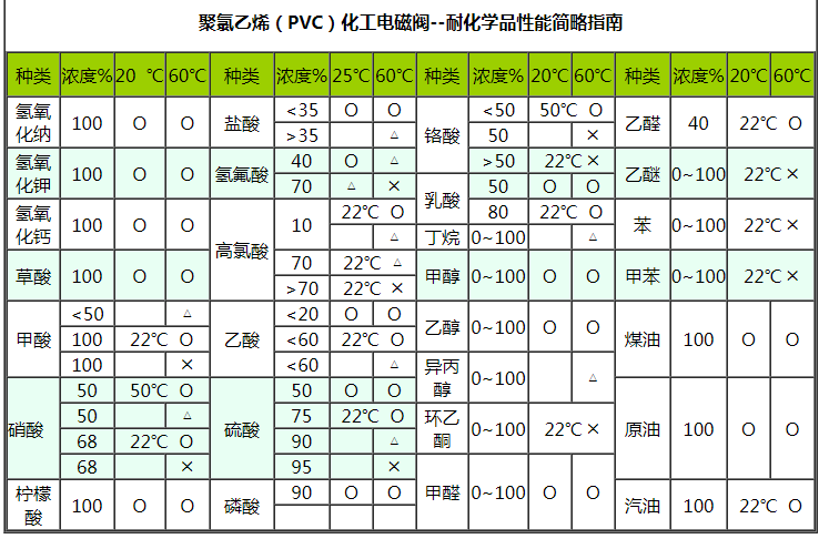 聚氯乙烯(PVC)化工電磁閥具有優(yōu)良的耐腐蝕性能,耐酸(包括稀硝酸)、堿、鹽、氣體、水等的腐蝕。對無極性的烷烴及強(qiáng)極性的羧酸、醇類有較大的抗溶劑能力。少數(shù)氧化性酸在濃度較高時對其有較大的腐蝕作用。有一定的剛度和強(qiáng)度,適用溫度為-0~60℃。